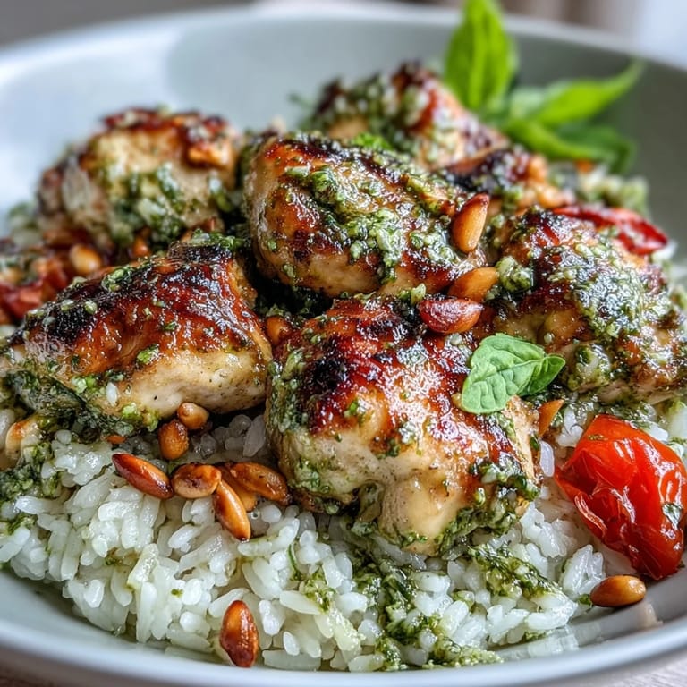 I made this for a friend who claimed she didn't like chicken because it always turned out dry. She finished her bowl before I even sat down. Watching her scrape up every last grain of rice made me realize how much texture and moisture matter. The pesto keeps the chicken juicy, and the tomatoes add little bursts of freshness that make each bite feel alive. Now she texts me every few weeks asking if I'm making those bowls again.