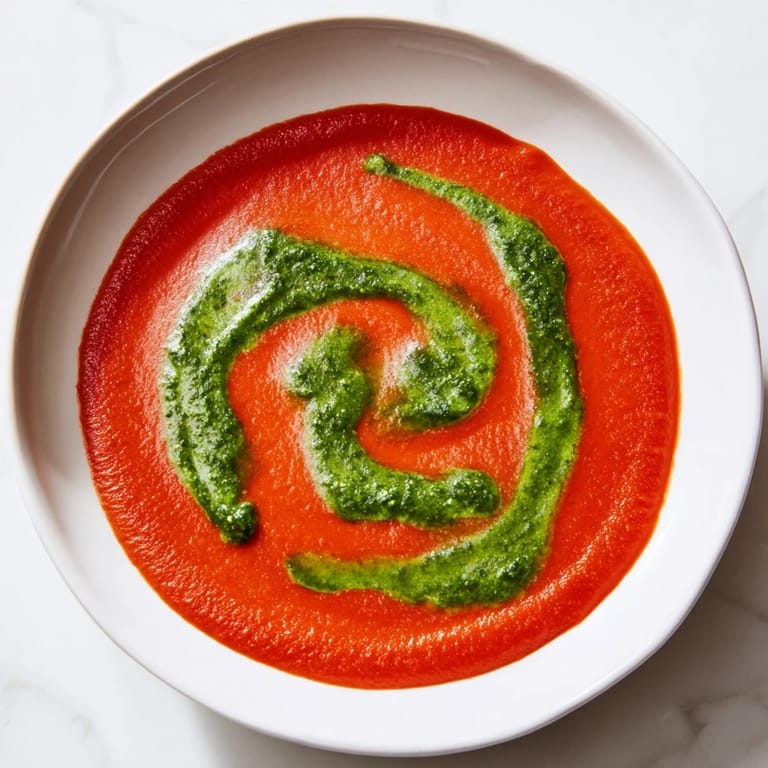 I once made this for a friend who swore she didnt like tomato soup, and she ate two bowls before admitting she was wrong. She said it was the pesto that changed her mind, that little jolt of garlic and cheese cutting through the sweetness. We sat at my kitchen table with crusty bread between us, dipping and talking until the pot was empty. That night taught me that sometimes all a familiar dish needs is one unexpected twist to become someones new favorite.
